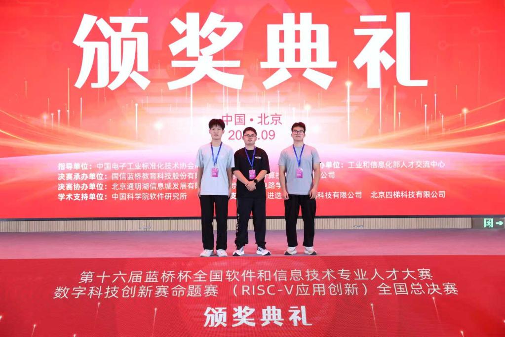 近日,由工业和信息化部人才交流中心主办、中国电子工业标准化技术协会RISC-V工作委员会承办的第十六届“蓝桥杯”数字科技创新赛命题赛(AIoT场景应用)全国总决赛在北京圆满落幕。在伟德bv国际体育刘相、马浩老师指导下,由李佳澳、付云鹏、刘康硕三位本科生组成的团队,凭借面向工业互联网智能制造场景研发的作品《二维码导航自动顶托AGV小车》,荣获全国一等奖,为学校在AIoT应用创新领域再添佳绩!